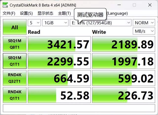 我用CrystalDiskMark实测,顺序读取速度达到3421 MB/s,顺序写入2189 MB/s,TxBENCH实测顺序读取速度达到3421 MB/s,顺序写入2359 MB/s。