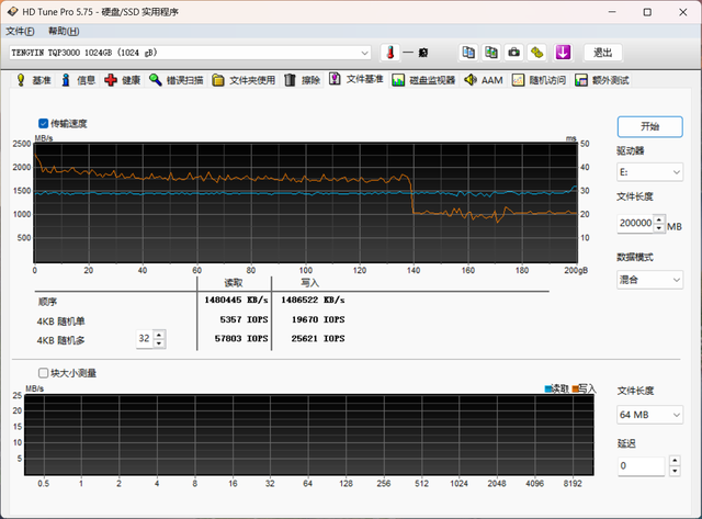 HD Tune进行200GB文件写入量测试,顺序读取速度1480MB/s,顺序写入速度1486MB/s,曲线平稳。