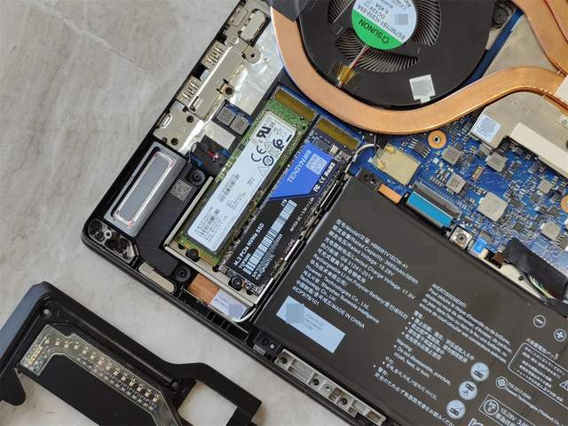 拆机过程比想象中简单:拧下笔记本底部的所有颗螺丝并撬开后盖,就能看到原装硬盘旁边预留的M.2插槽(荣耀猎人支持双M.2硬盘扩展)。拔掉原装硬盘的固定螺丝,取下旧盘,将腾隐TQP3000对准插槽插入,拧紧螺丝就完成了安装,整个过程不到10分钟。