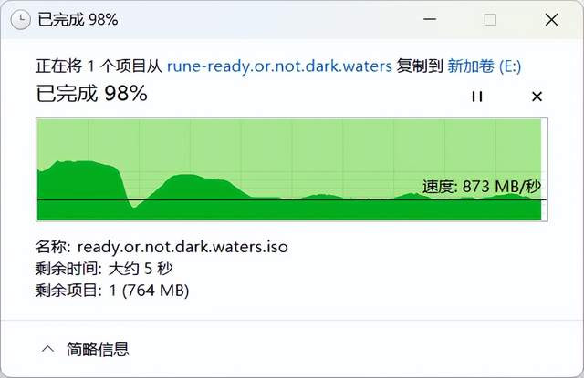 使用系统自带的拷贝程序向腾隐TQP3000拷贝一个64GB包含各种琐碎的游戏文件,传输速度稳定在873MB/s+,整体传输曲线很稳定。
