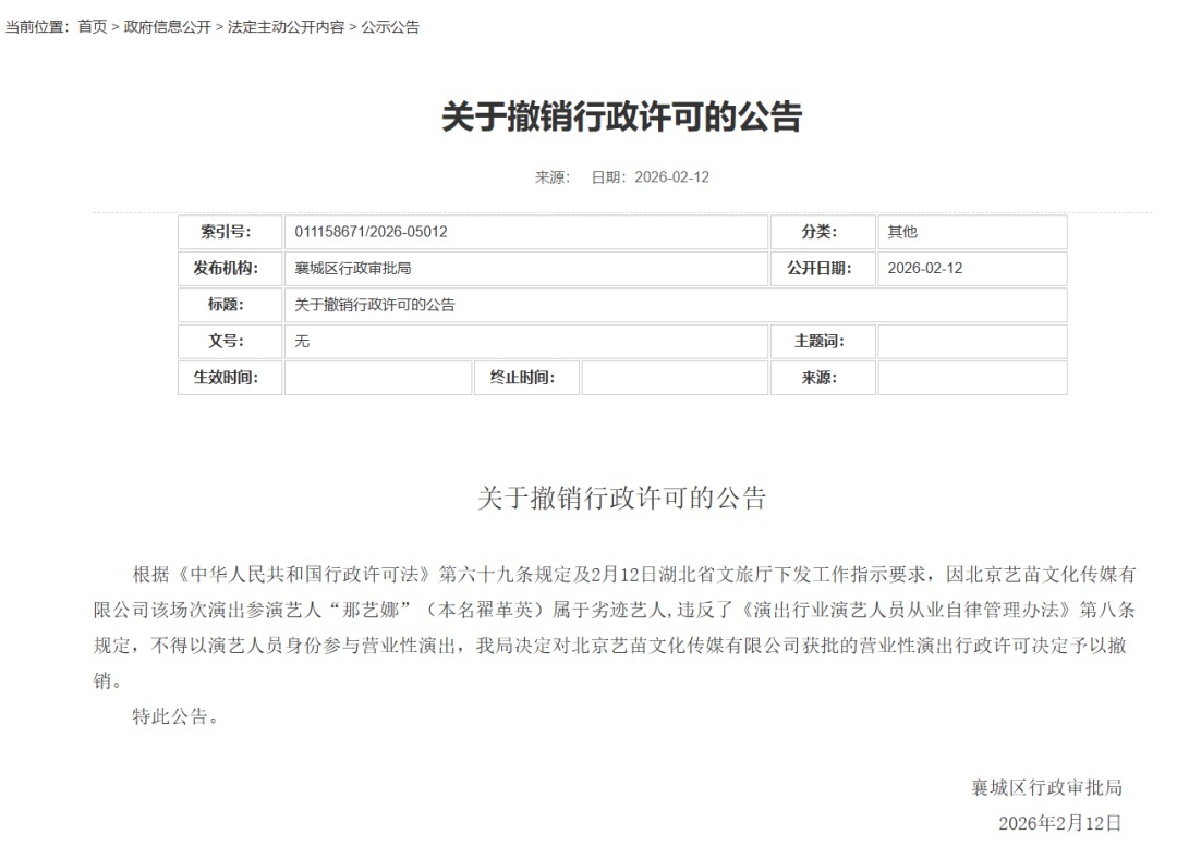 近日,湖北省襄阳市襄城区行政审批局发布关于撤销行政许可的公告,根据《中华人民共和国行政许可法》第六十九条规定及2月12日湖北省文旅厅下发工作指示要求,因北京艺苗文化传媒有限公司该场次演出参演艺人“那艺娜”(本名翟革英)属于劣迹艺人,违反了《演出行业演艺人员从业自律管理办法》第八条规定,不得以演艺人员身份参与营业性演出,该局决定对北京艺苗文化传媒有限公司获批的营业性演出行政许可决定予以撤销。