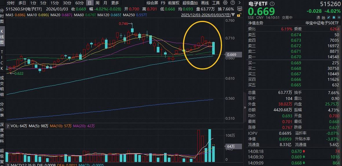 此前7连阳的电子ETF(515260)今日(3月3日)随市回调,场内价格现跌4.02%实盘10倍杠杆平台,看好电子板块核心龙头后市表现的资金或迎来逢跌布局机遇。