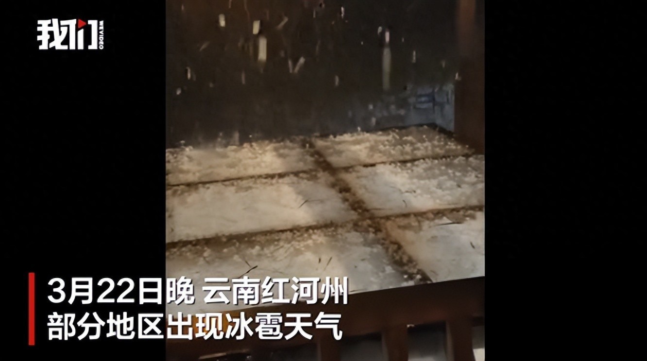 3月22日晚,云南红河州部分地区出现冰雹天气。当地居民马先生称,冰雹持续时间不长,直径有两到三厘米,搭的篷被打穿。