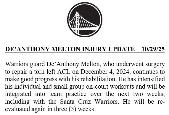 根据勇士队的消息,梅尔顿目前已开启“个人训练”和“小团体训练”;球队计划在未来几周内,将他逐步纳入球队合练,且合练将同时覆盖NBA主队与发展联盟的圣克鲁斯勇士队——后者的训练频率高于金州勇士主队。